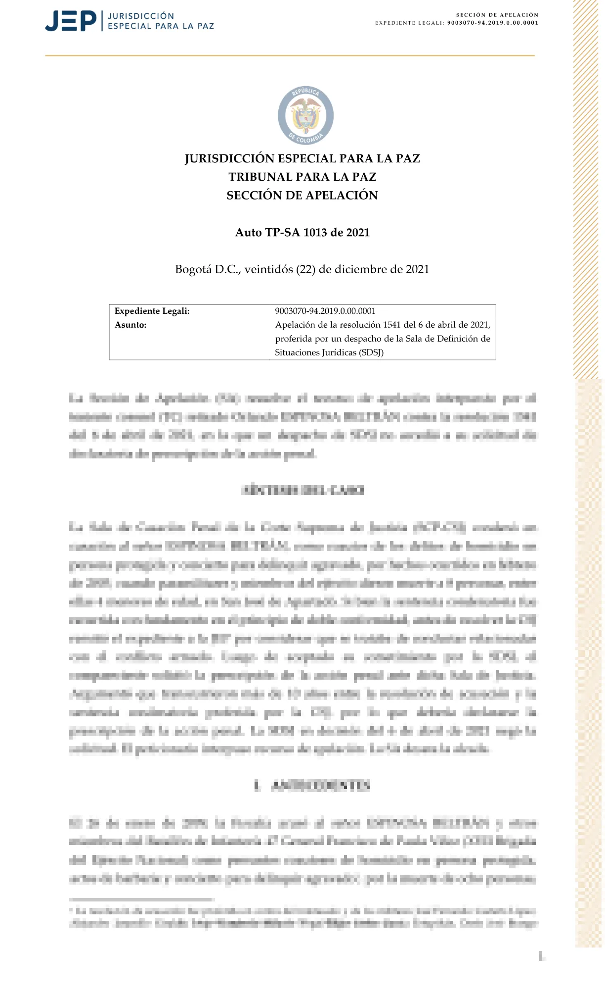 JEP. 2021. Auto TP-SA 1013. Espinosa Beltràn. Prescripción.pdf